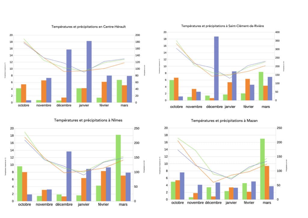 Les cumuls sont impressionnants sur ce seul mois de décembre (plus de 300mm sur Montpellier, Durban Corbières, le Boulou, 170 mm à Nîmes). Et une accumulation de statistiques marquantes : le mois de décembre le plus pluvieux depuis 1959 en Languedoc-Roussillon, le mois de février le plus pluvieux depuis 1959 en Occitanie, 10 jours de pluie à Montpellier en janvier (+72% par rapport à la moyenne), 10 jours de pluie en février (+144%)….